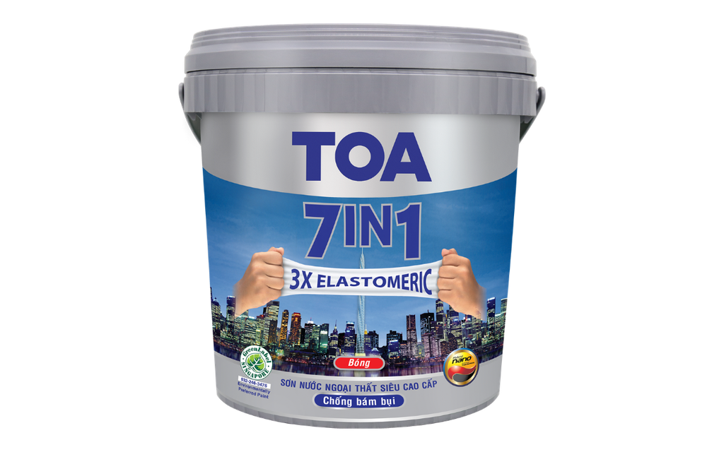 TOA 7IN1 - Sơn nước ngoại thất siêu cao cấp được sản xuất từ nhựa acrylic nguyên chất với công nghệ tiên tiến Hybrid Nano®, có khả năng đàn hồi gấp 3 lần đem lại độ che phủ tối đa, bảo vệ hiệu quả bề mặt công trình từ tác động của khí hậu khắc nghiệt Việt Nam. Sơn TOA 7IN1 hội tụ đầy đủ 7 đặc tính quan trọng nhất của một loại sơn ngoại thất: